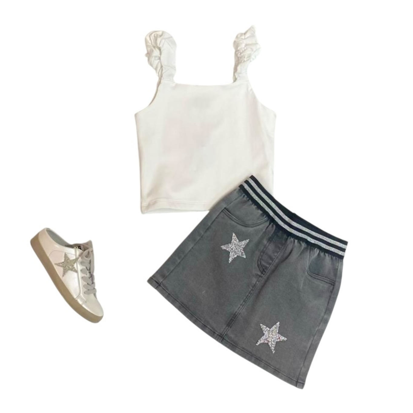 WHITE TANK & BLACK DENIM SKIRT WITH STARS AND ELASTIC WAIST.