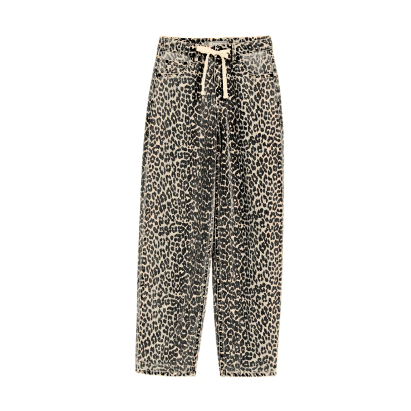 Add a wild twist to your wardrobe with the Cleo Jeans featuring a playful leopard print slight barrel silhouette. The comfy drawstring waist lets you adjust the fit just right, blending style and ease effortlessly. Perfect for casual days when you want to feel fierce and fun all at once!