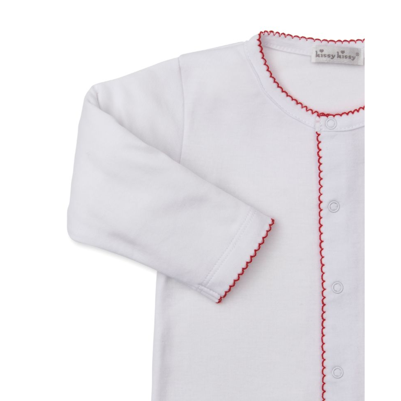 This adorable button-up footie pajama features charming embroidered details including "Baby's First Christmas," a cute teddy bear, a festive present, and a scalloped hem for a fun and festive look.