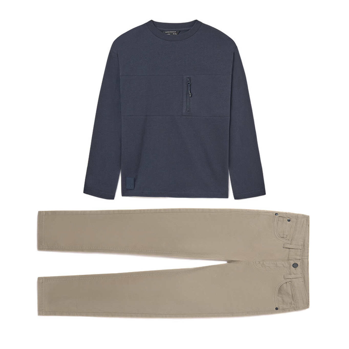 This set includes a long-sleeve tee with cool zipper pocket accent and sleek, slim-fit pants for a stylish look.