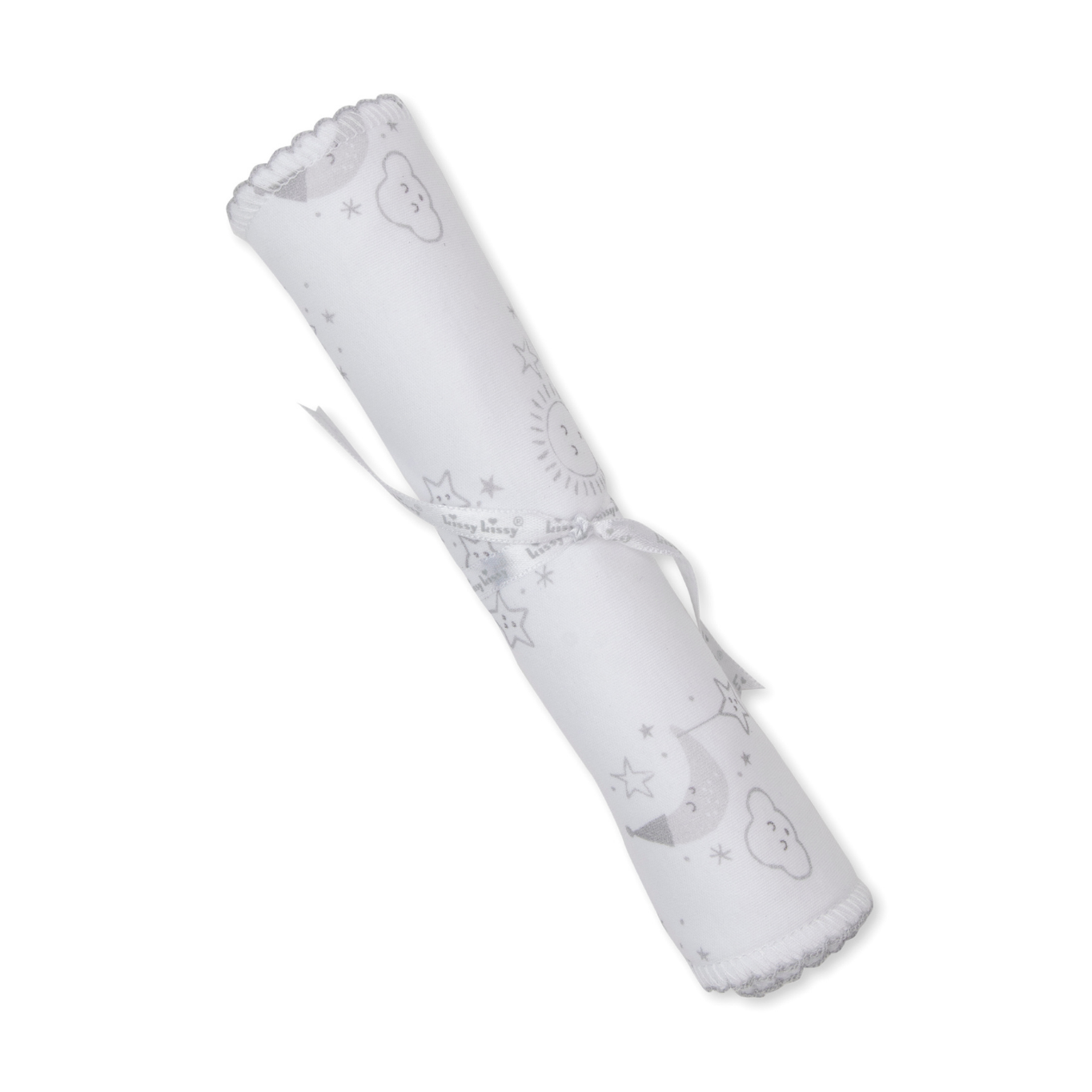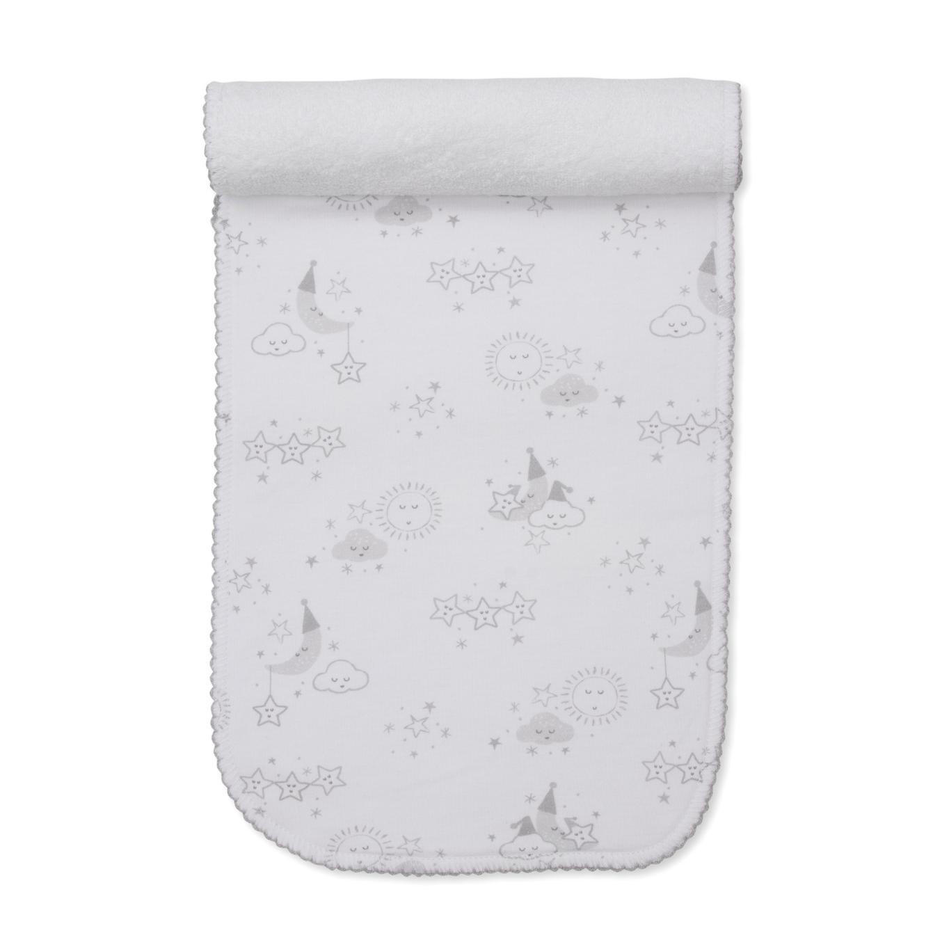 Adorable baby burp made from super-soft fabric, featuring a sweet nightfall and sunset print and a beautifully embroidered trim for an extra charming touch.